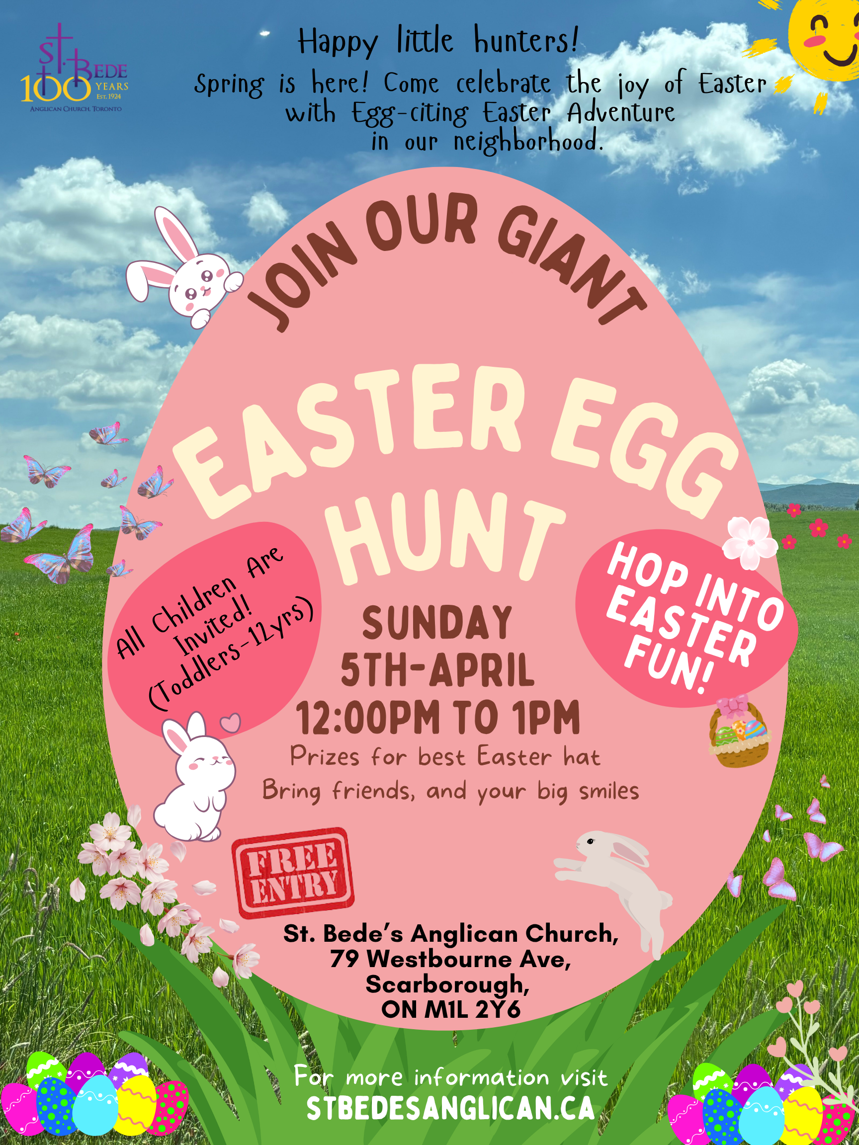 Spring is here! Come celebrate the joy of Easter with Egg-citing Easter adventure in our neighborhood. We warmly invite all families in and around St. Bede’s Anglican Church to join us for a joyful Community Easter Egg Hunt on April 5, 2026, from 12:00 PM to 1:00 PM. This special family event is lovingly organized to bring children, parents, and neighbors together in a spirit of fellowship, laughter, and celebration. As children delight in searching for colorful eggs, we also take a moment to reflect on the true meaning of Easter — the gift of new life, hope, and the boundless love of Jesus Christ.